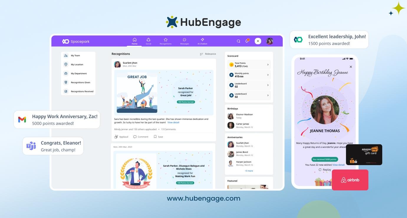 Organizations can deploy the recognition hub as a standalone solution or expand it with other modules from the HubEngage employee experience platform suite such as intranet, social feed, AI surveys, messaging, and an AI chatbot.