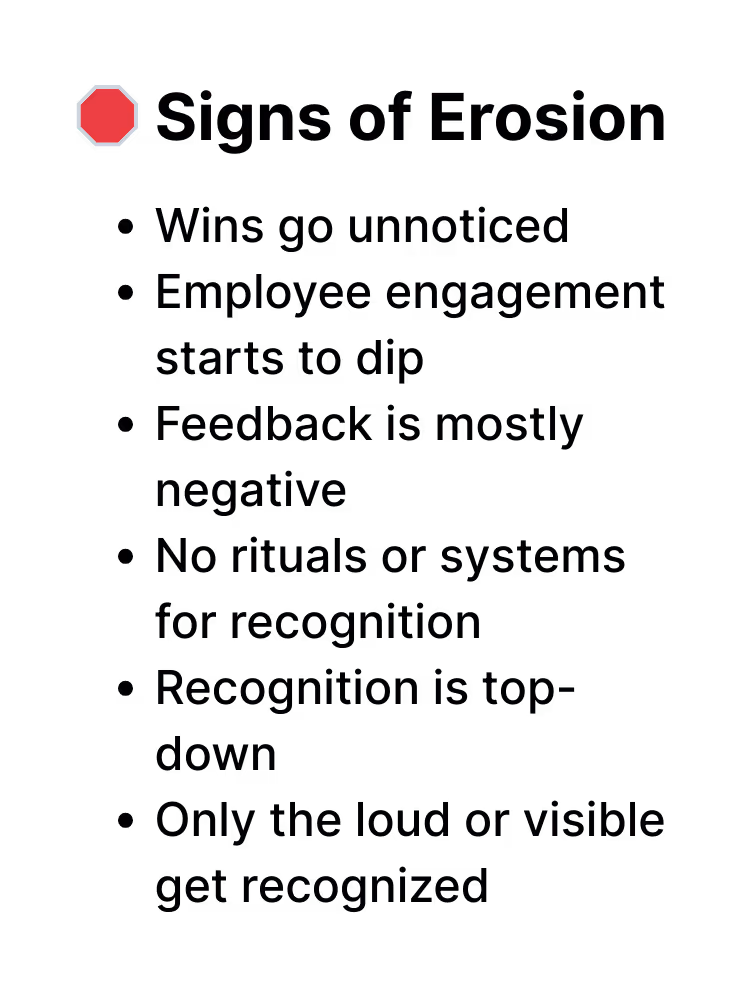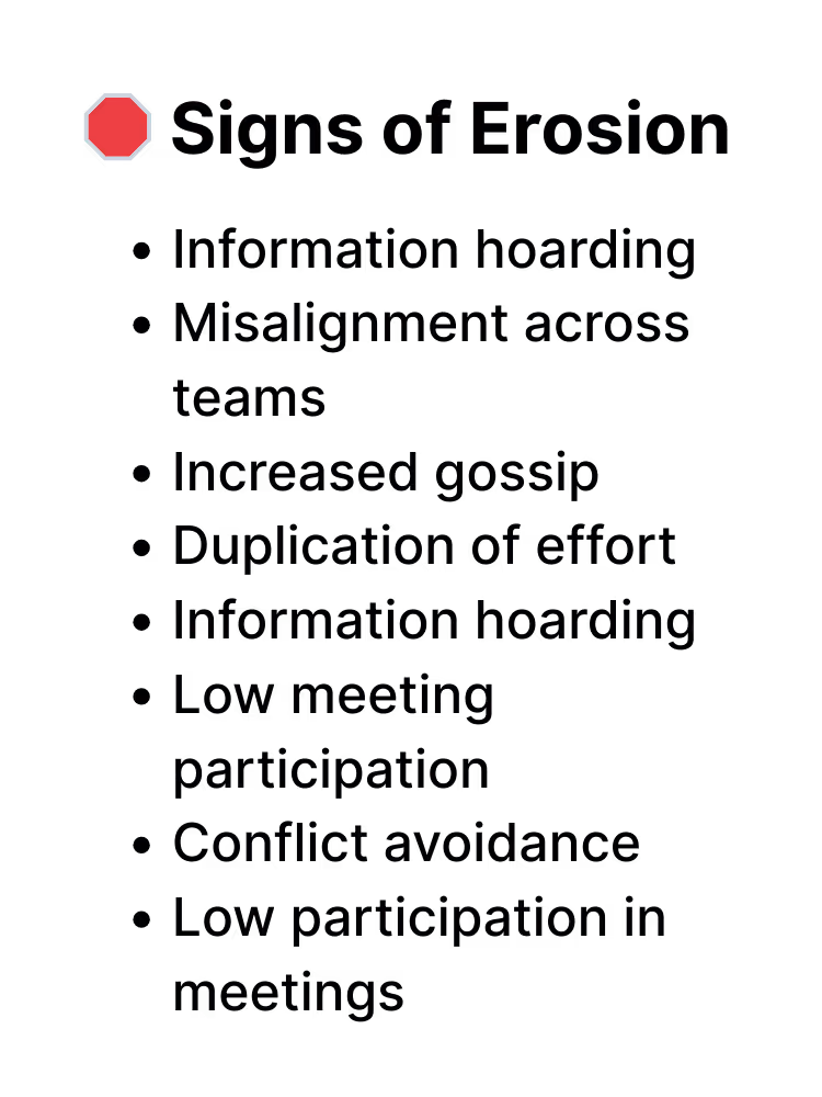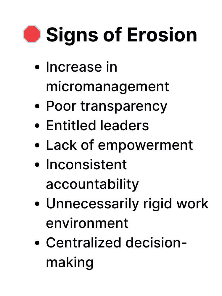 The gradual weakening or loss of the shared values, behaviors, trust, and sense of connection that once defined an organization’s identity — often occurring quietly over time as the company scales or undergoes change.