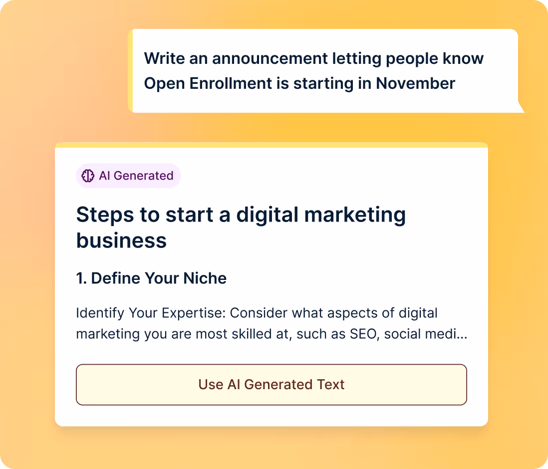 No more spending hours finding the right words. With our AI-assisted writer, you can craft professional, personalized content in a fraction of the time. Get your messages out faster while still maintaining a polished, engaging tone that resonates with your team.