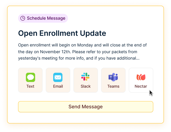 When something needs to go out now, skip the editor. Nectar Comms lets you send plain text messages instantly across email, SMS, Slack, Teams, and more. So the right people get critical updates the moment they need them.
